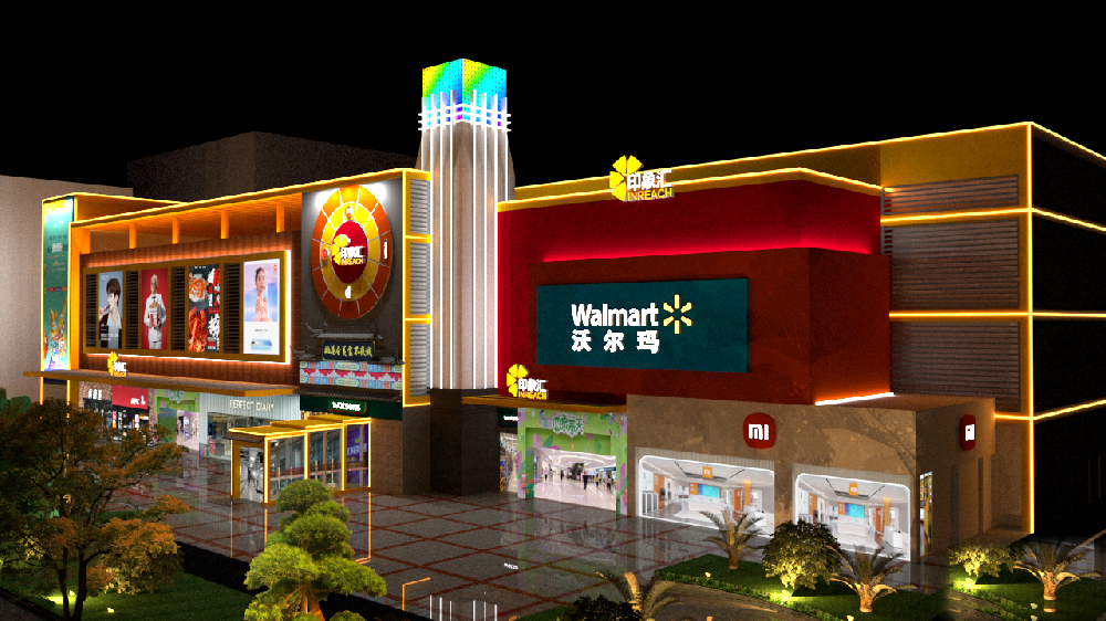 在具體方案中,設(shè)計(jì)團(tuán)隊(duì)采用 "分層布光、主次呼應(yīng)" 的策略:建筑主立面以 3000K 暖白光洗墻燈為基礎(chǔ),通過(guò)精準(zhǔn)的光束角控制,勾勒出簡(jiǎn)潔大氣的建筑輪廓,既凸顯了現(xiàn)代商業(yè)建筑的利落線條,又與沃爾瑪超市的溫馨消費(fèi)氛圍相適配;裙樓部分則創(chuàng)新采用暗藏式 LED 線條燈,沿商鋪招牌的邊緣有序排布,在夜間形成連貫的光影燈帶,既保證了商鋪標(biāo)識(shí)的清晰呈現(xiàn),又避免了強(qiáng)光對(duì)行人的視覺(jué)干擾。這種設(shè)計(jì)既尊重了建筑原有結(jié)構(gòu),又通過(guò)燈光層次的變化,讓建筑在夜色中呈現(xiàn)出 "遠(yuǎn)觀有輪廓,近賞有細(xì)節(jié)" 的視覺(jué)效果。