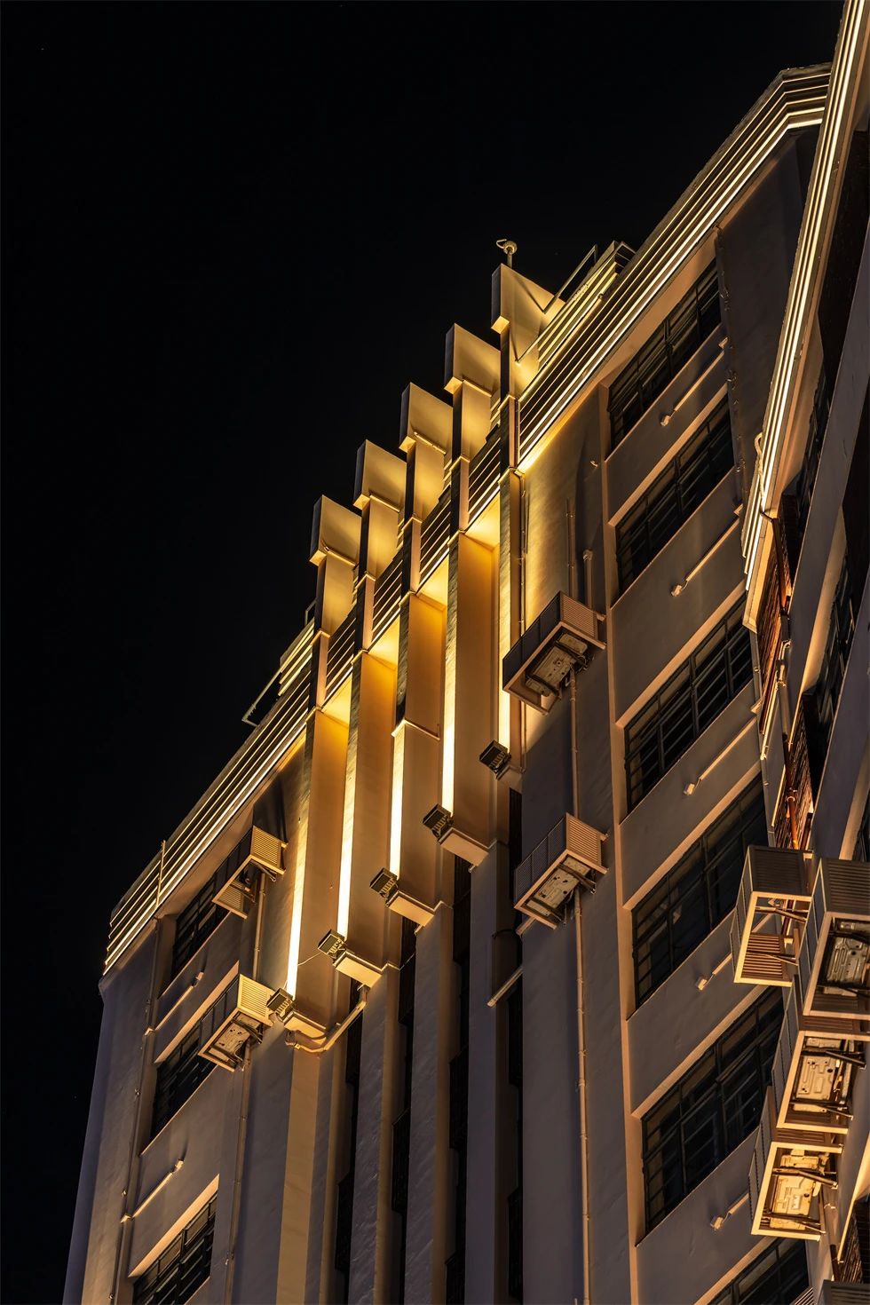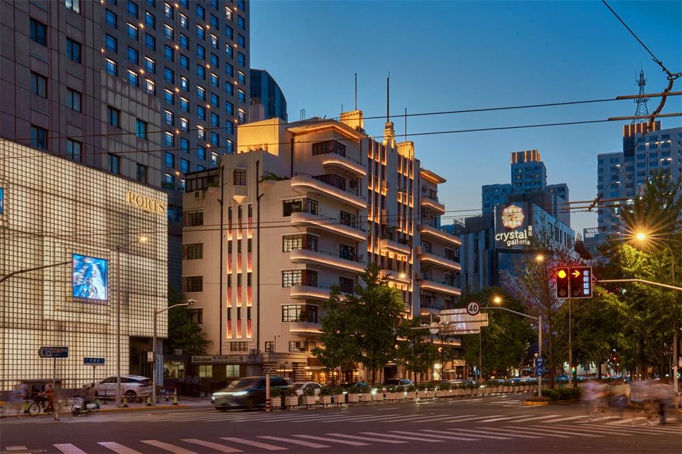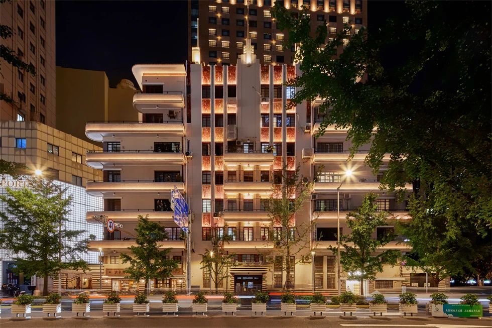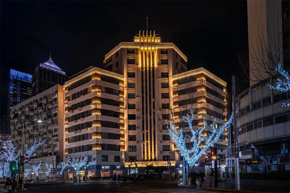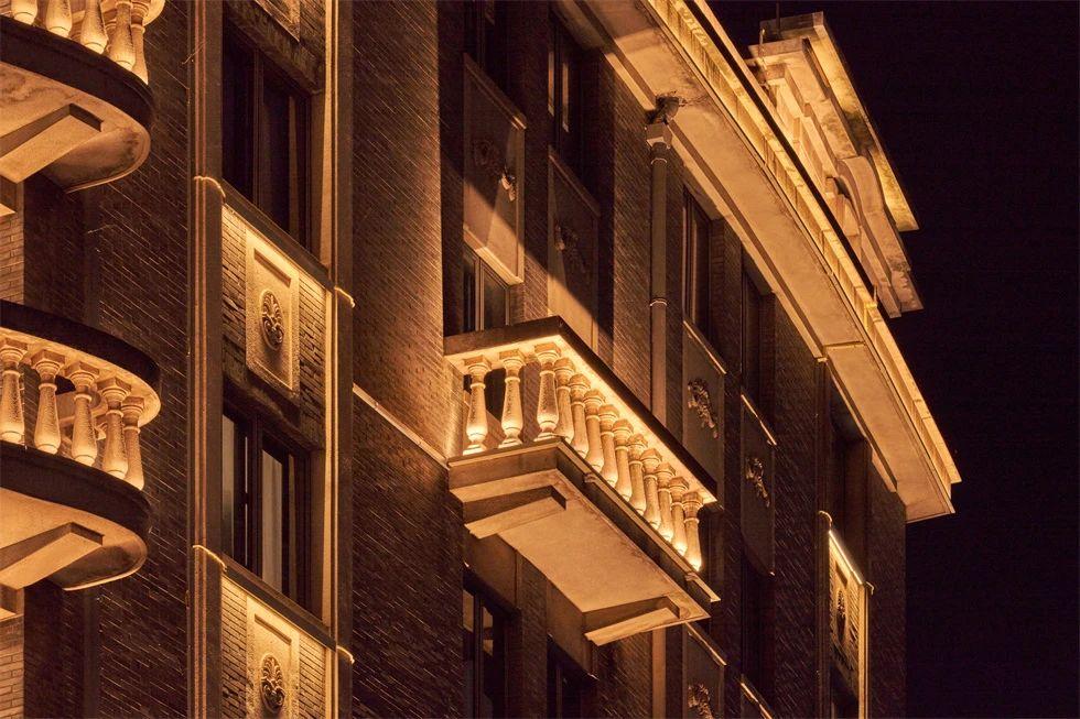 常德公寓為1936年竣工的裝飾藝術派風格建筑,夜景重點表現(xiàn)其東立面,層層向上的燈光富有節(jié)奏地烘托中部豎向線條,柔和升起的水平線性燈光優(yōu)雅細膩地展現(xiàn)弧形伸展的陽臺,配合搖曳發(fā)光的裝飾燈,典雅低調(diào),令人駐足。